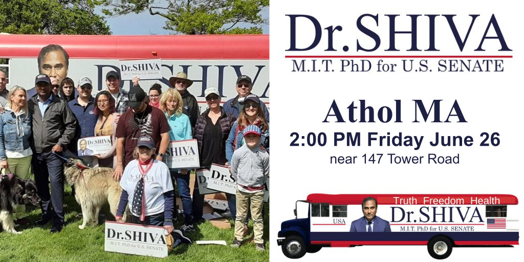 Dr.SHIVA on the Bus at Athol June 26, 2020 2:00 pm – 4:00 pm ( EDT ) Near 147 Tower Road, Athol MA Meet Dr.SHIVA and the Shiva 4 Senate campaign team at Athol.This event has endedPhoto Gallery