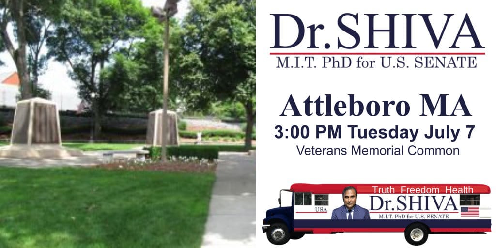 Dr.SHIVA on the Bus at Attleboro July 7, 2020 3:00 pm – 6:00 pm ( EDT ) Veterans Memorial Common, Attleboro, MA Meet Dr.SHIVA and the Shiva 4 Senate campaign team at Attleboro. Get lawn signs & bumper stickers!!This event has endedPhoto Gallery
