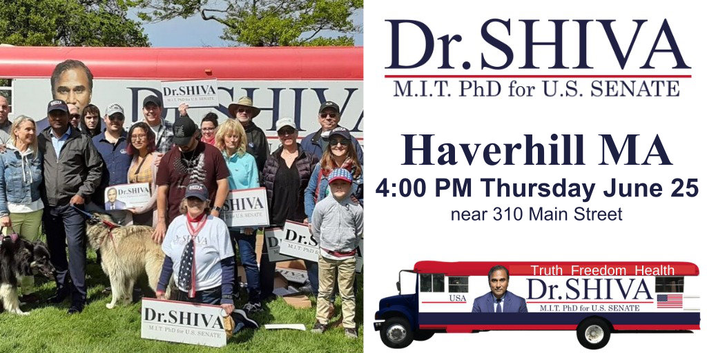 Dr.SHIVA on the Bus at Haverhill June 25, 2020 4:00 pm – 6:00 pm ( EDT ) Near 310 Main Street, Haverhill MA Meet Dr.SHIVA and the Shiva 4 Senate campaign team at Haverhill.This event has endedPhoto Gallery
