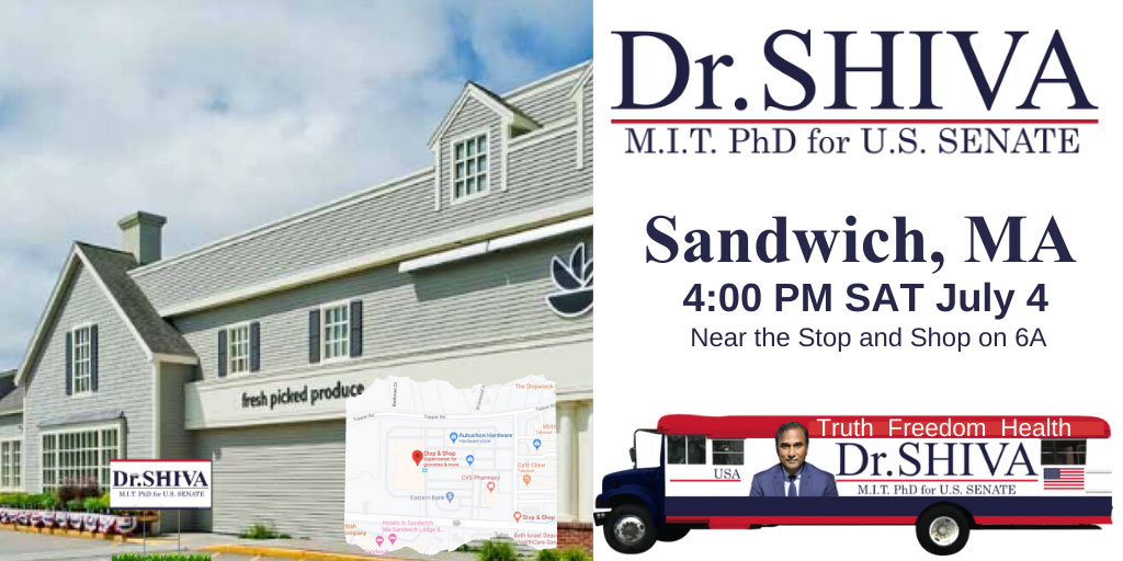 Dr.SHIVA on the Bus at Sandwich July 4, 2020 4:00 pm – 5:30 pm ( EDT ) Near the Stop and Shop on 6A, Sandwich, MA Meet Dr.SHIVA and the Shiva 4 Senate campaign team at Sandwich. Get lawn signs & bumper stickers!!This event has endedPhoto Gallery