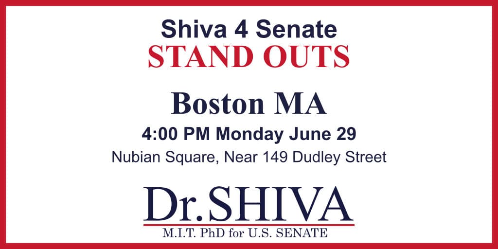 Stand Out at Boston June 29, 2020 4:00 pm – 6:00 pm ( EDT ) Nubian Square, Near 149 Dudley St, Boston MA Come, be a part of the Shiva 4 Senate Stand Out at Boston on Monday, June 29.This event has endedPhoto Gallery